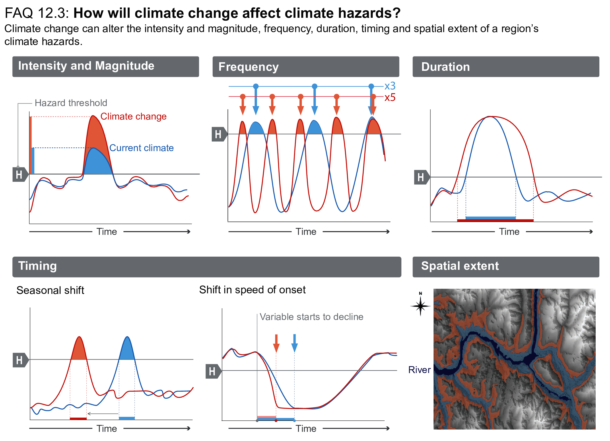 This chapter is new in IPCC WGI assessment reports, in that it represents a contribution to the ‘IPCC risk framework’. Within this framework, climate-related impacts and risks are determined through an interplay between the occurrence of climate hazards and their consequences depending on the exposure of the affected human or natural system and its vulnerability to the hazardous conditions. In Chapter 12, we are assessing climatic impact-drivers that could lead to hazards or to opportunities, from the literature and model results since AR5. This will particularly support the assessment of key risks related to climate change by WGII (Chapter 16). Despite the fact that impacts may also be induced by climate adaptation and mitigation policies themselves, as well as by socio-economic trends, changes in vulnerability or exposure, and external geophysical hazards such as volcanoes, the focus here is only on climatic impacts and risks induced by shifts in physical climate phenomena that directly influence human and ecological systems (Cross-chapter Box 1.3).