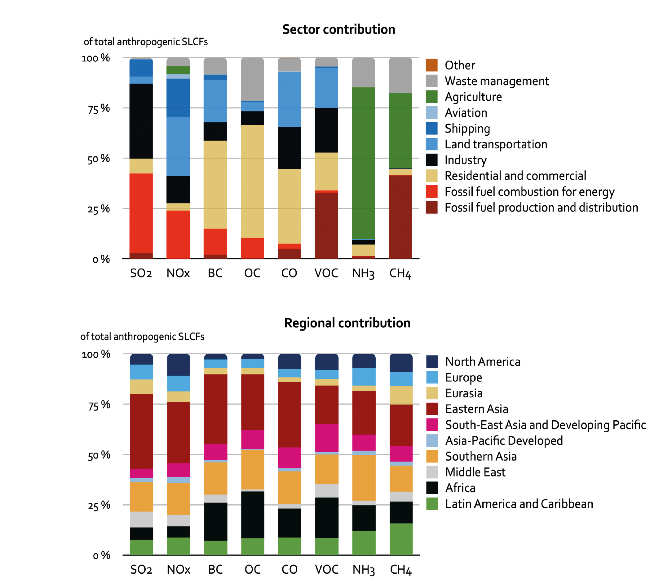 At present, emissions from the residential and commercial sectors (fossil and biofuel use for cooking and heating) and the energy sector (fossil fuel production, distribution and combustion) contribute the most to the world population’s exposure to anthropogenic fine PM (high confidence), whereas emissions from the energy and land transportation sectors contribute the most to ozone exposure (medium tohigh confidence). The contribution of different sectors to PM varies across regions, with the residential sector being the most important in Southern Asia and Africa, agricultural emissions dominating in Europe and North America, and industry and energy production dominating in Central and Eastern Asia, Latin America and the Middle East. Energy and industry are important PM2.5 contributors in most regions, except Africa (high confidence). Sector contributions to surface ozone concentrations are similar for all regions. {6.6.2}