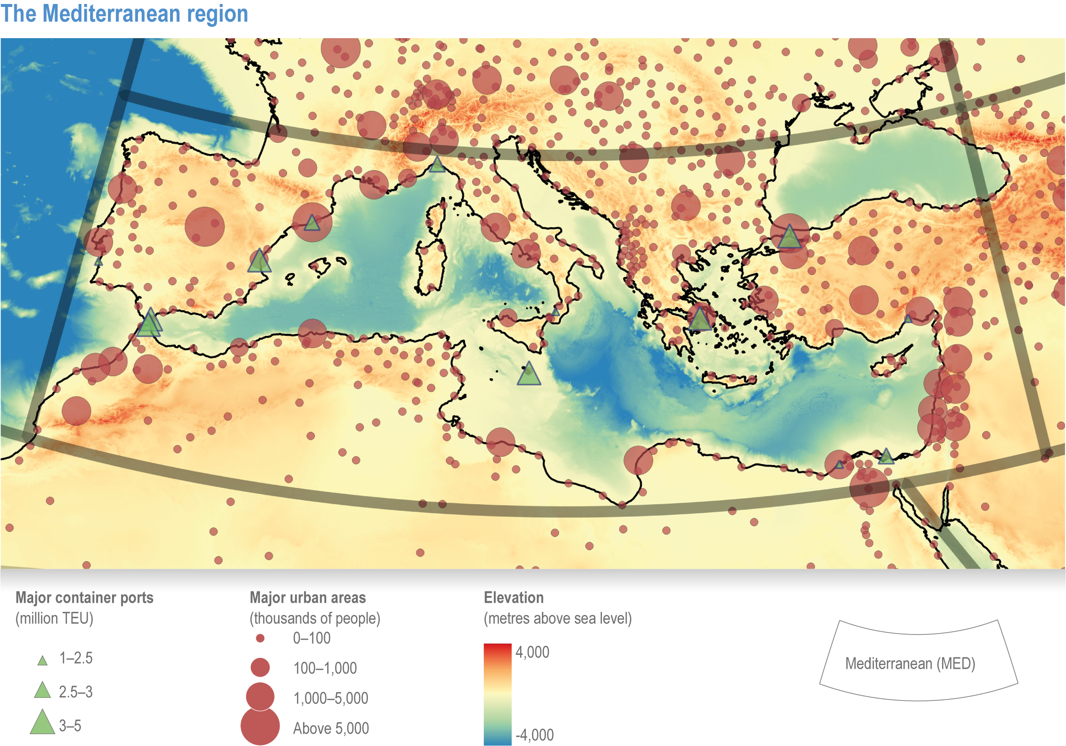 Figure CCP4.1 | The Mediterranean region: Topography and bathymetry (colour bar in metres), main urban areas (population in thousands for 2020 from w ww. naturalearthdata.com ), container ports (millions of TEU [twenty-foot container equivalent units] in 2017, from International Association of Ports and Harbours) and borders of the Mediterranean region used in WGI AR6 Chapter 10 (Doblas-Reyes et al., 2021).