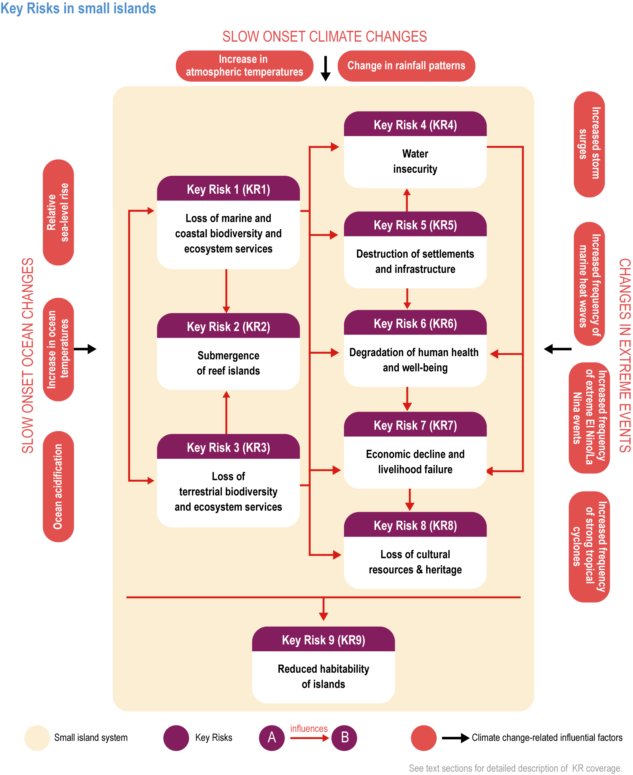 The reduced habitability of small islands is an overarching significant risk caused by a combination of several key risks facing most small islands even under a global temperature scenario of 1.5°C (high confidence) . These are loss of marine and coastal biodiversity and ecosystem services; submergence of reef islands; loss of terrestrial biodiversity and ecosystem services; water insecurity; destruction of settlements and infrastructure; degradation of health and well-being; economic decline and livelihood failure); and loss of cultural resources and heritage. Climate-related ocean changes, including those for slow-onset events, and changes in extreme events are projected to cause and/or amplify Keys Risks in most small islands. Identification of key risks facilitates the selection of optimal context-specific adaptation options. Moreover, it can distil the benefits and/or disadvantages and long-term implications of choosing such options (high confidence) {15.3.4.9}.