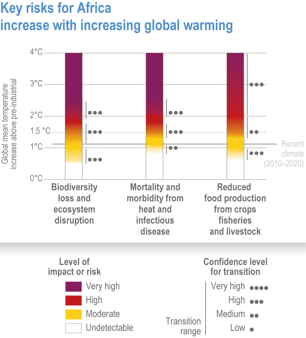 Between 1.5°C and 2°C global warming—assuming localised and incremental adaptation—negative impacts are projected to become widespread and severe with reduced food production, reduced economic growth, increased inequality and poverty, biodiversity loss, increased human morbidity and mortality (high confidence). Limiting global warming to 1.5°C is expected to substantially reduce damages to African economies, agriculture, human health, and ecosystems compared to higher levels of global warming (high confidence). {9.2, 9.6.2, 9.8.2, 9.8.5, 9.10.2, 9.11.2}